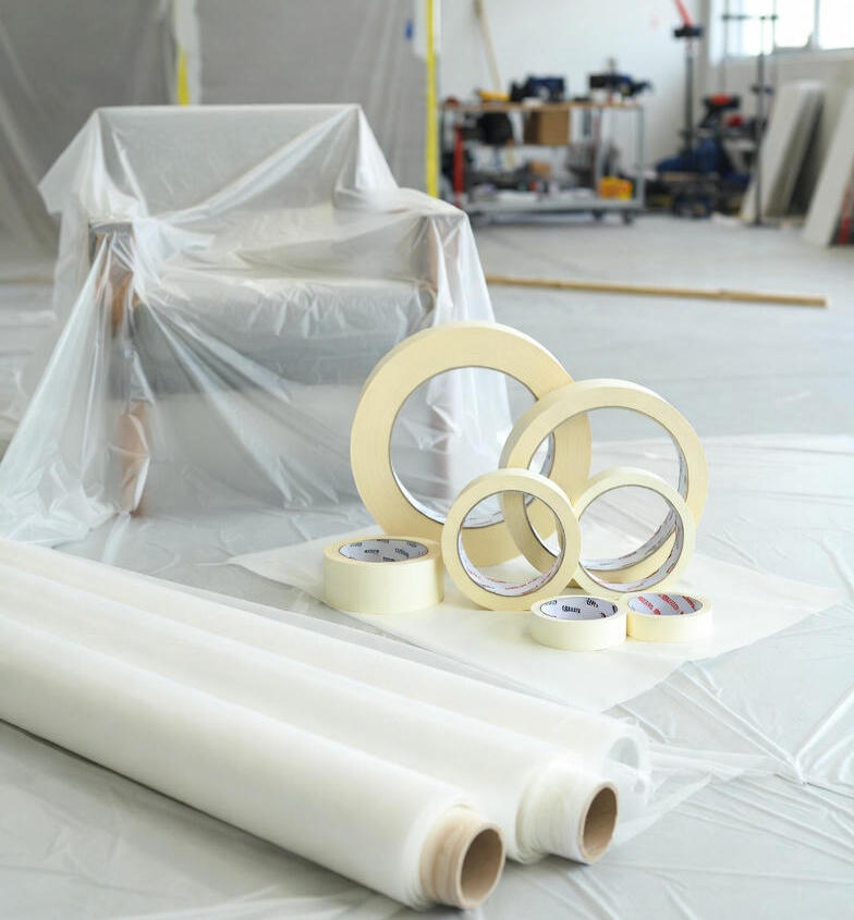 Cinta de enmascarar profesional en varios tamaños. Bordes limpios y retirada sin residuos.